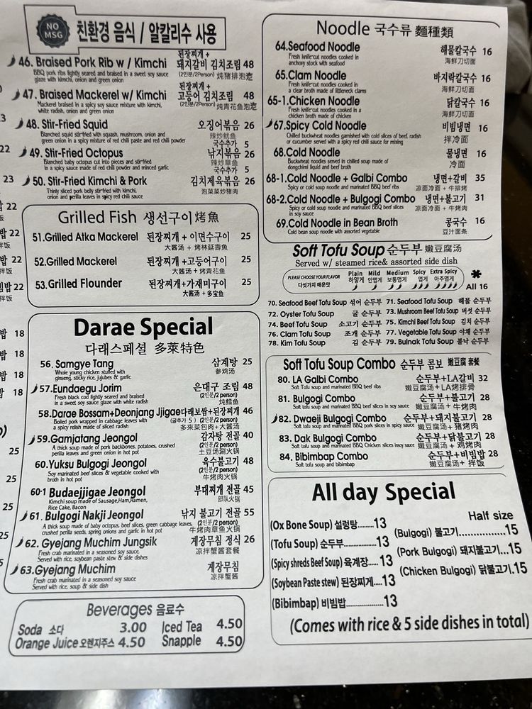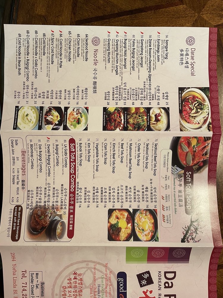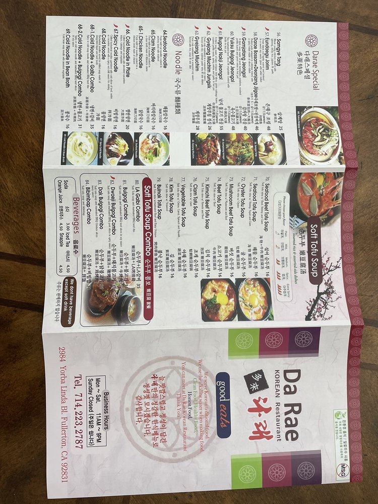 “ We were craving "soup" during a chilly winter night. Yelp suggested a nearby Korean Tofu Soup. The Da Rae BBQ Restaurant is not well lite in the late hours. The small restaurant is located behind another Japanese restaurant and wedge between car wash express. The restaurant is very cramped and establishment hasn't be updated for some time so looks outdated. There are approximately 8 tables accommodating small family or groups. Being 1.5 hours before closing, we were quickly seated, orders taken and food came out fairly soon. The only complaint was two items were missed and we had to remind the owner. Ironically, those were "bbq" items. haha! The banchans (complementary side dishes) were good. The kimchi and cucumbers were the best. We ordered a side of japchae (cold glass noodles) and it was disappointing. The tofu combo soup is delicious and flavorful. There are option for spice level so amp it up if you can handle the heat. Overall, the service is good. The owner is very cordial. I will certainly return to support this mom and pop shop. ”