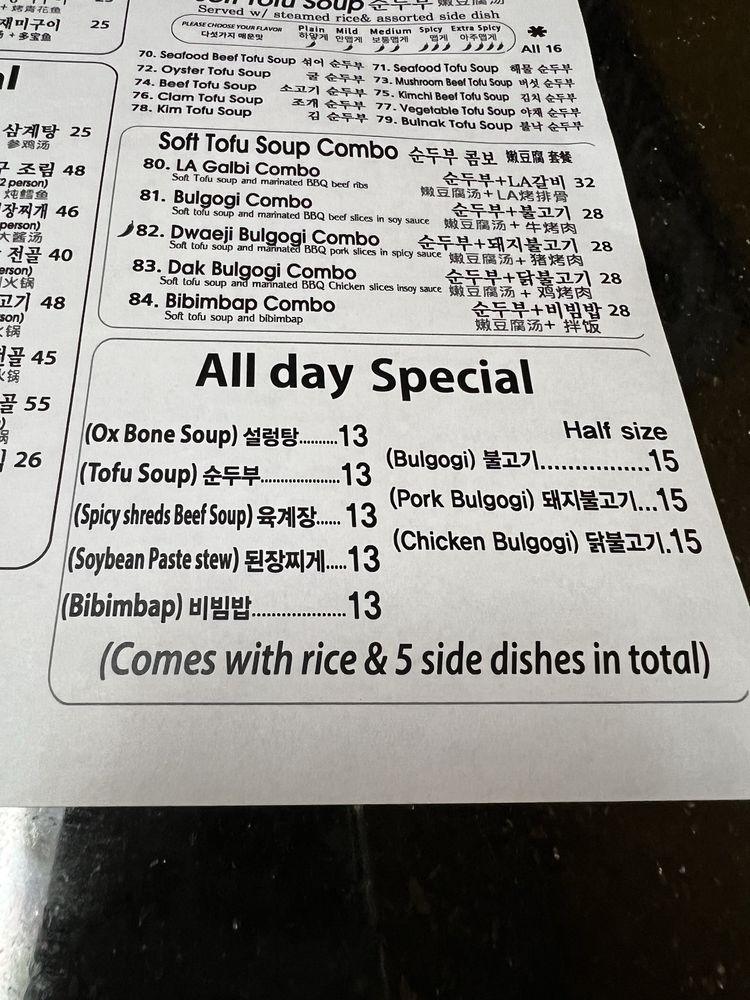 “ Arrived around 6pm and tables started filling. We got the Galbi+nangmyeon combo and yukdaejang. They brought out a complimentary carrot and onion pancake and sides came out soon after. Portions were decent and food was delicious. Side dishes are refillable and are authentic! Definitely making this my go-to spot, can't beat the $13-$15 ALL-DAY SPECIALS! ”